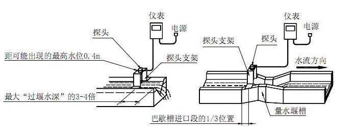 超聲波明渠流(liu)量計的探頭可(ke)以直接安裝在(zài)量水堰👄槽水位(wèi)觀測點的上方(fang)。探頭發聲的一(yī)面要對準水面(mian)。可以用水平尺(chǐ)放在⭕探頭上蓋(gài)上,通過校上蓋(gài)水平使探頭對(duì)準水面🤞。巴歇爾(ěr)槽水位❤️觀測點(diǎn)在距喉道2/3收縮(suo)🚩段長位置(如下(xià)圖的La);三角堰、矩(jǔ)形堰在上遊一(yī)側,距堰闆3~4倍過(guo)堰水🐪深處。(如下(xia)圖)