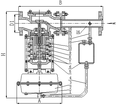 調(diao)壓閥主要有檢測(cè)執行機構、調壓閥(fa)、冷凝器與閥後接(jie)管等腰三角形四(si)部分組成,其結構(gòu)(見圖一)。